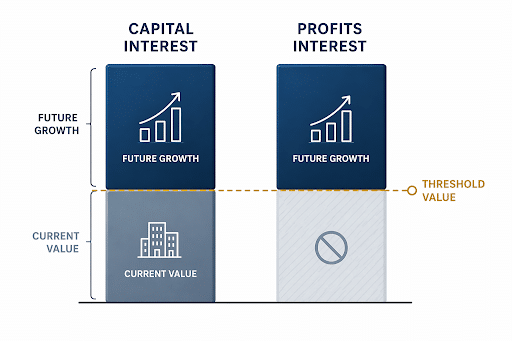 It usually does not give the holder the company’s current liquidation value on the grant date. That is why a profits interest differs from a capital interest and preserves existing value.