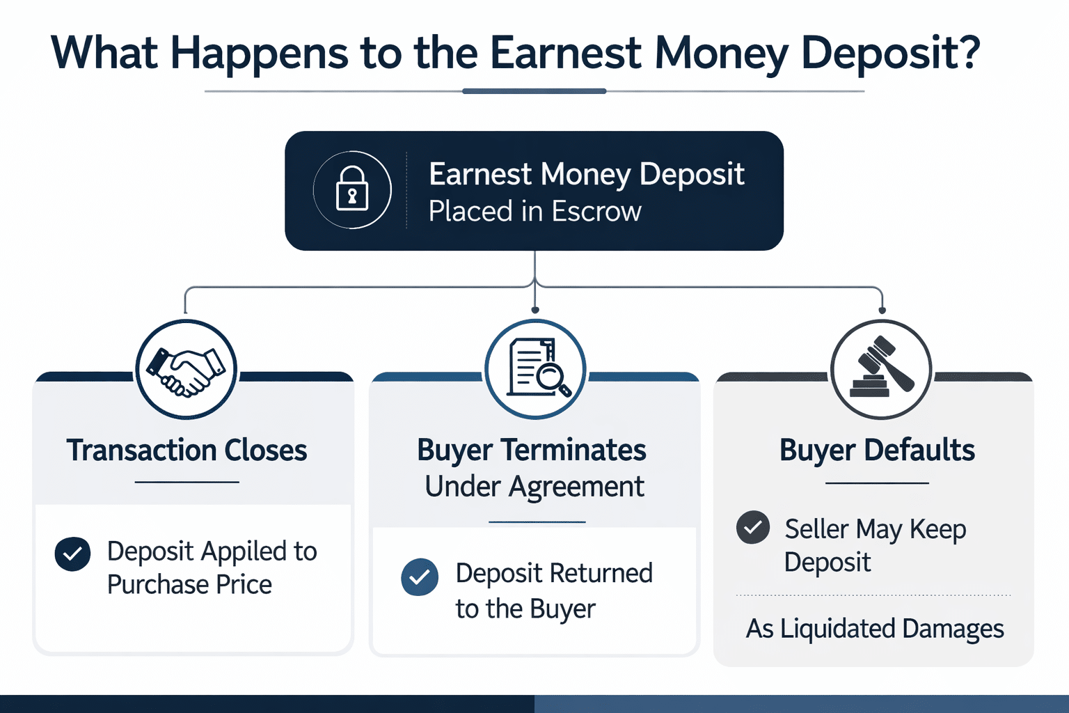 A well-drafted asset purchase agreement should clearly address how the earnest money deposit will be handled if the transaction does not close. Clear terms reduce the risk of a deposit dispute and help the escrow holder determine how the funds should be released.