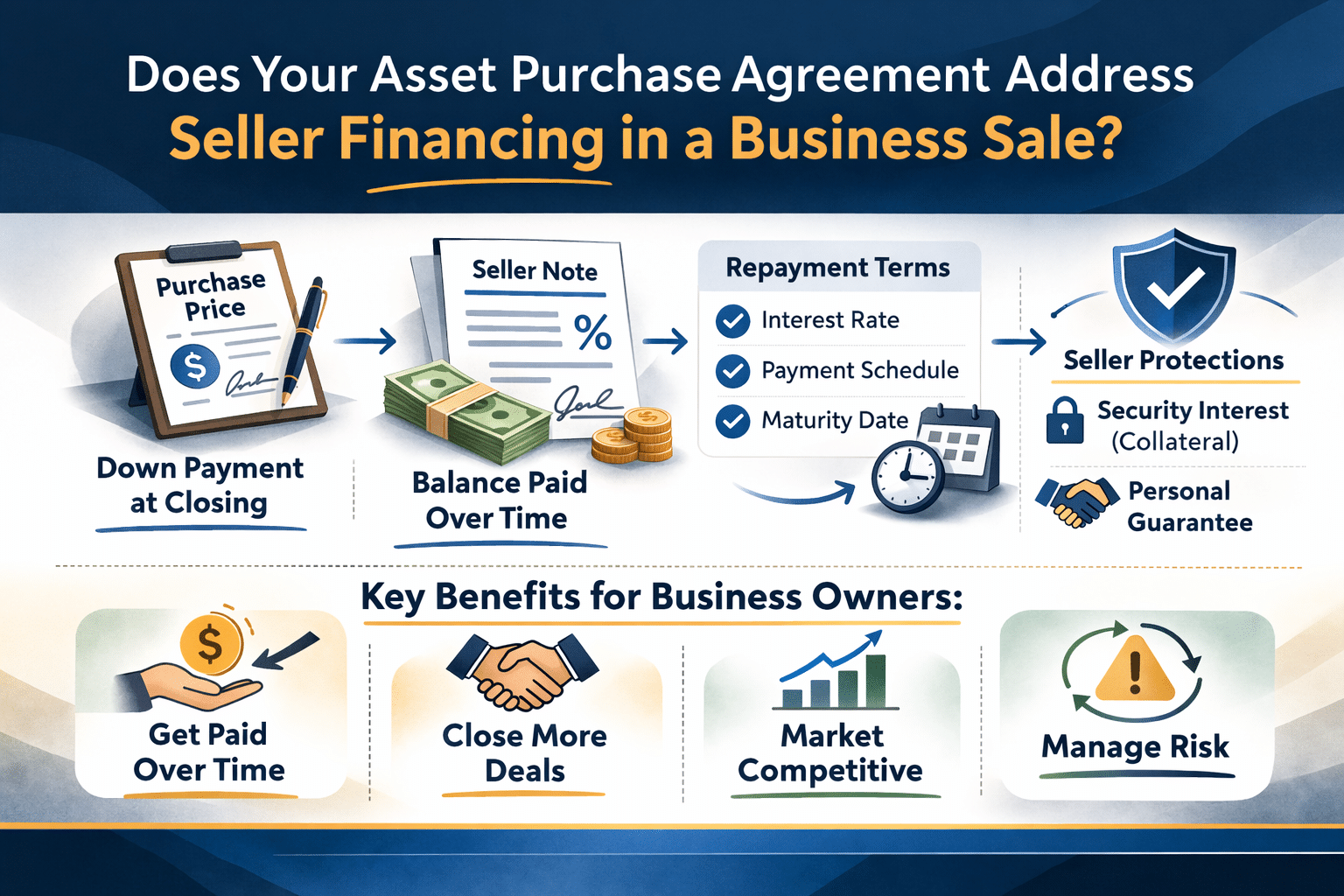 This article explains how seller financing works in a business sale and what your asset purchase agreement should address, including the down payment, promissory note, repayment terms, security interests, and legal protections that may help you reduce risk.